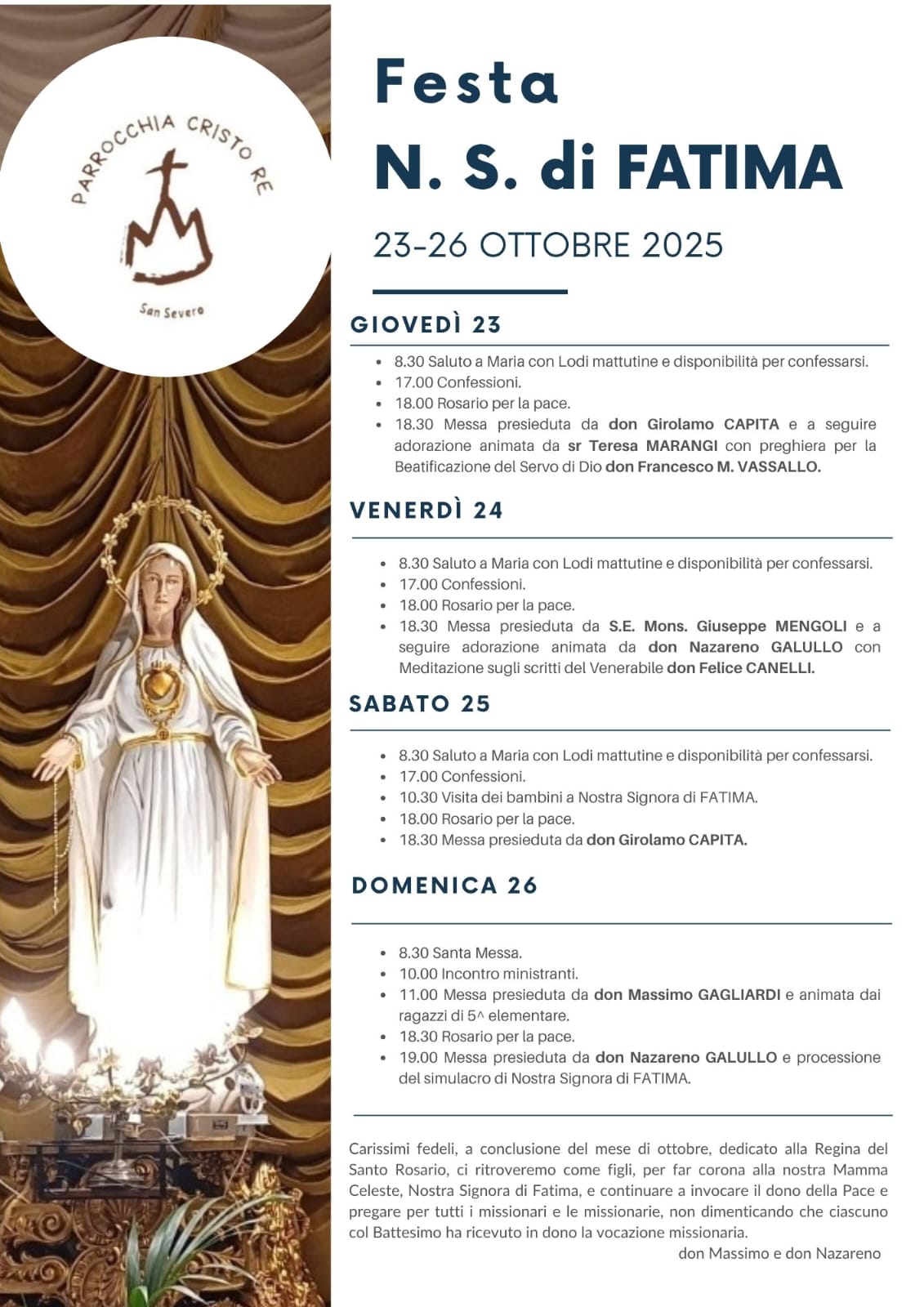 Di seguito il programma della Festa Nostra Signora di Fatima dal 23 al 26 ottobre 2025