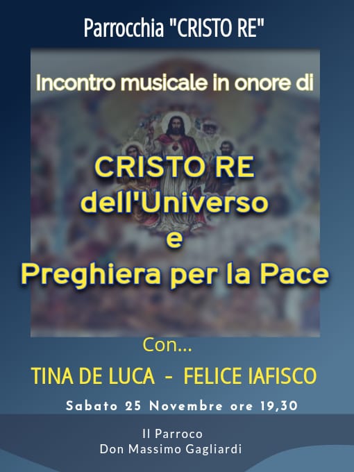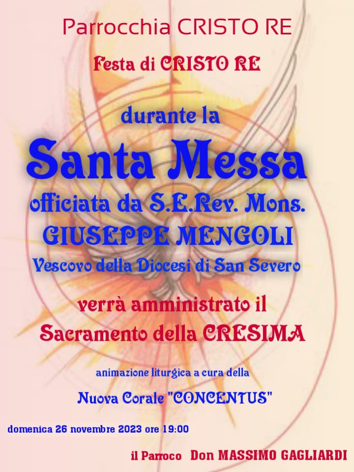 La comunità parrocchiale di Cristo Re di San Severo invita tutti a presenziare domenica 26 novembre 2023 alle ore 19 alla Santa Messa officiata da S.E. Rev. Mons. Giuseppe Mengoli ( Vescovo della Dicoesi di San Severo) durante la quale verrà amministrato il sacramento della Cresima.
